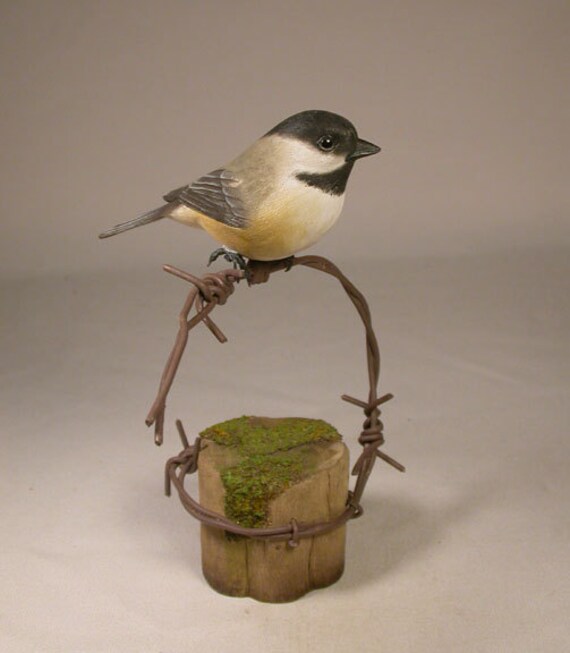 Black Capped Chickadee On Barbed Wire Hand Carved Wooden Bird Etsy